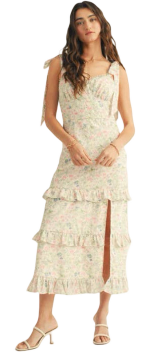 Apparel- Just Me Shoulder Tie Floral Lace Ruffle Detail Maxi Dress