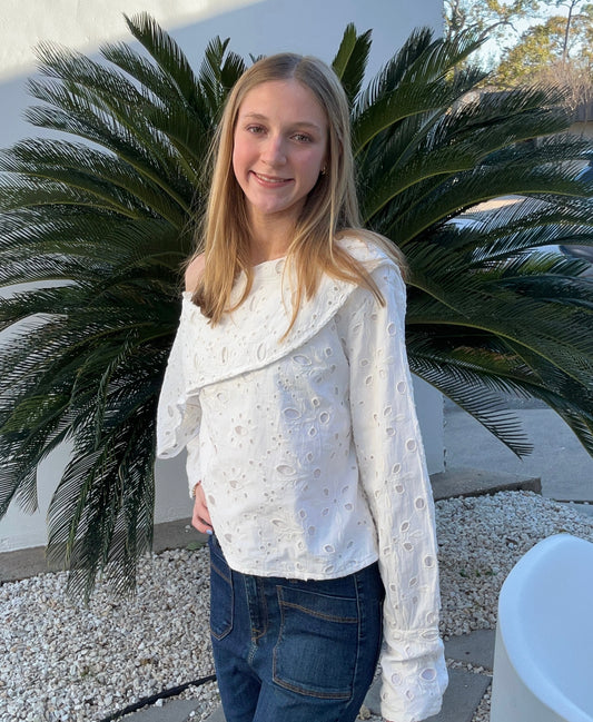 Apparel- Just Bellina Eyelet Off Set Long Sleeve Top
