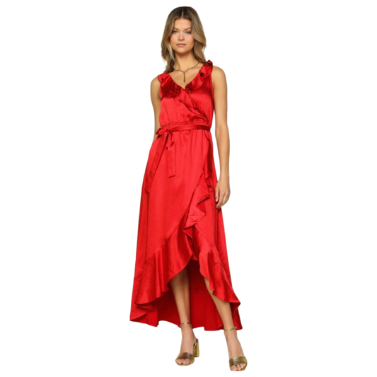 Apparel- Skies Are Blue Satin Ruffle Maxi Dress Red