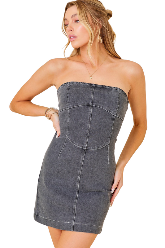 Apparel- Baby Pink Stitchwork Strapless Slim Denim Dress