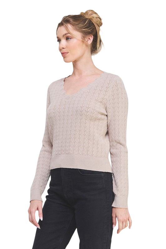 Apparel-Allie Rose Pointelle Pullover V Scalloped Neck Top