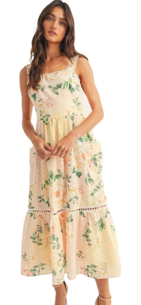 Apparel- Just Me Floral Printed Embroidered Sleeveless Midi Dress