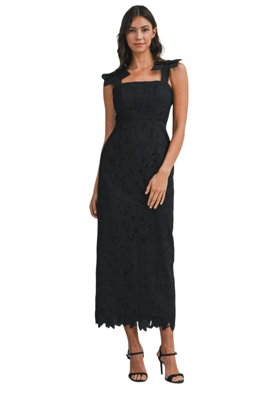 Apparel- Mable Eyelet Lace Shoulder Tie Midi Dress
