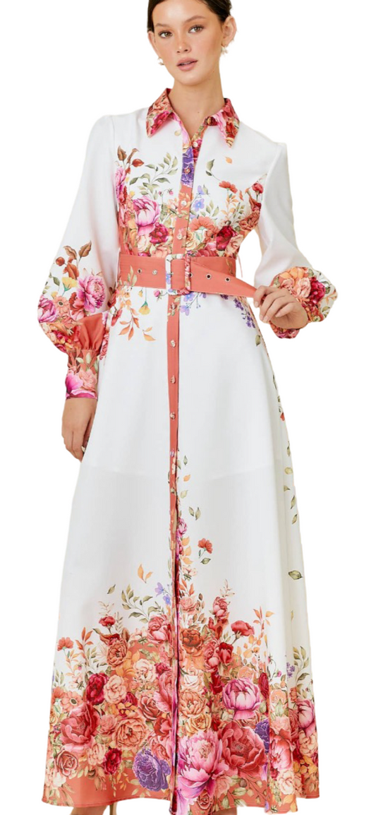 Apparel- Main Strip Collar Maxi Dress With Floral Border Print