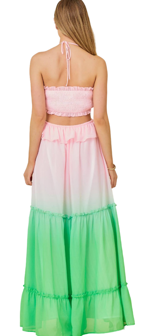 Apparel- Main Strip Ombre Print Oring Ruffle Waist Cut Maxi Dress
