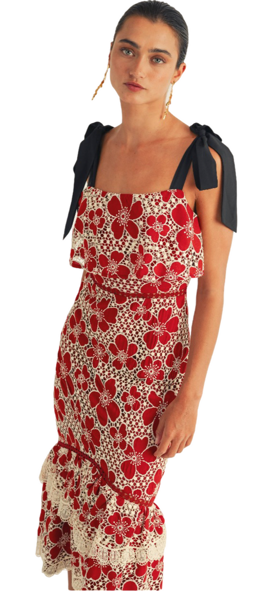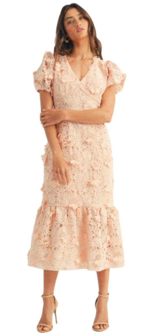 Apparel- Just Me Flower Embo Lace Ruffle Bottom Midi DressRegular price $ 148.00 USDRegular priceUnit price / per-