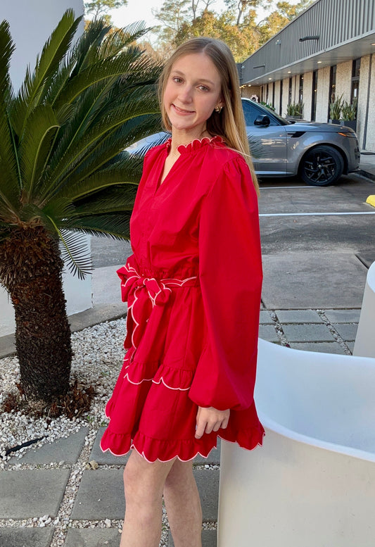 Apparel- Main Strip Scallop Edge Trim Solid Mini Dress