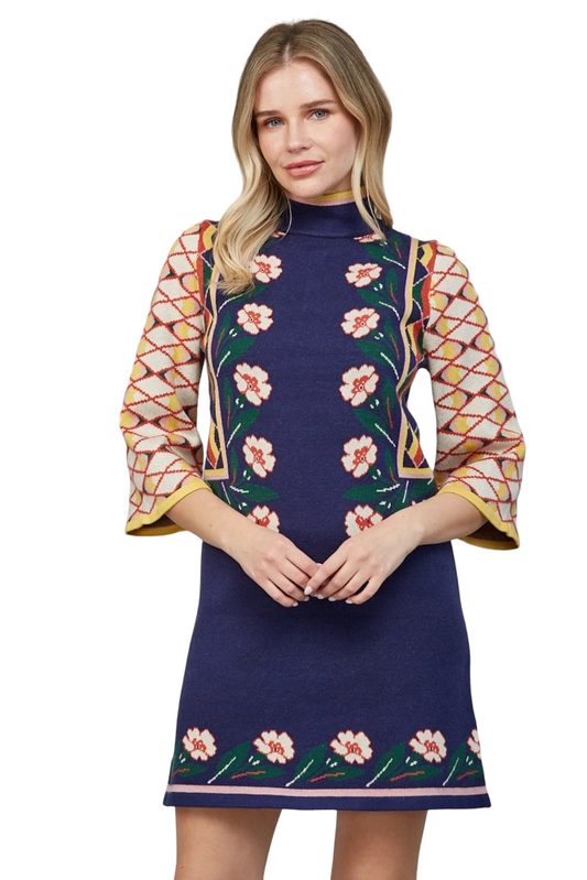 Apparel-Fate Jacquard Motif High Neck Floral Sweater Mini Dress