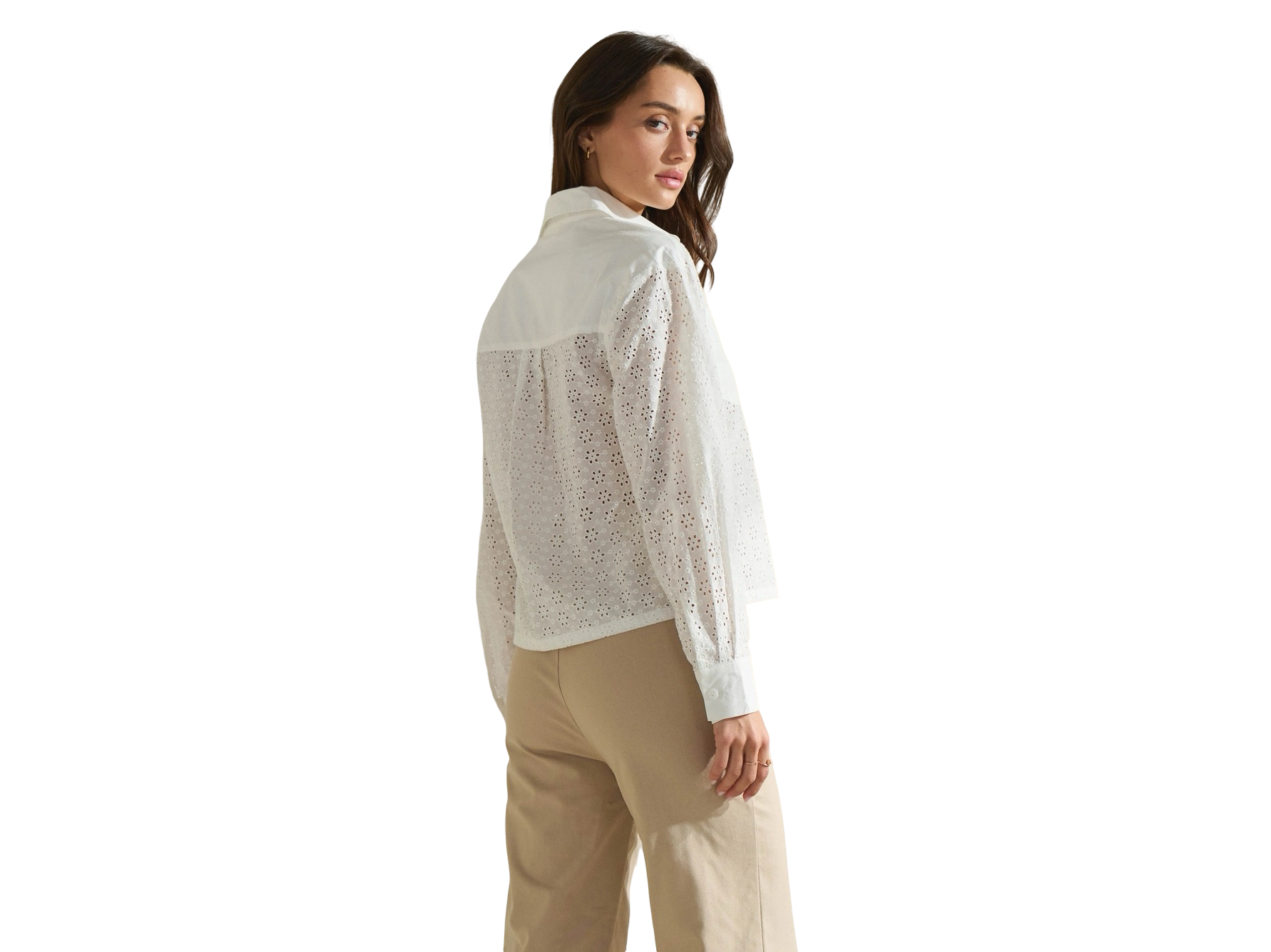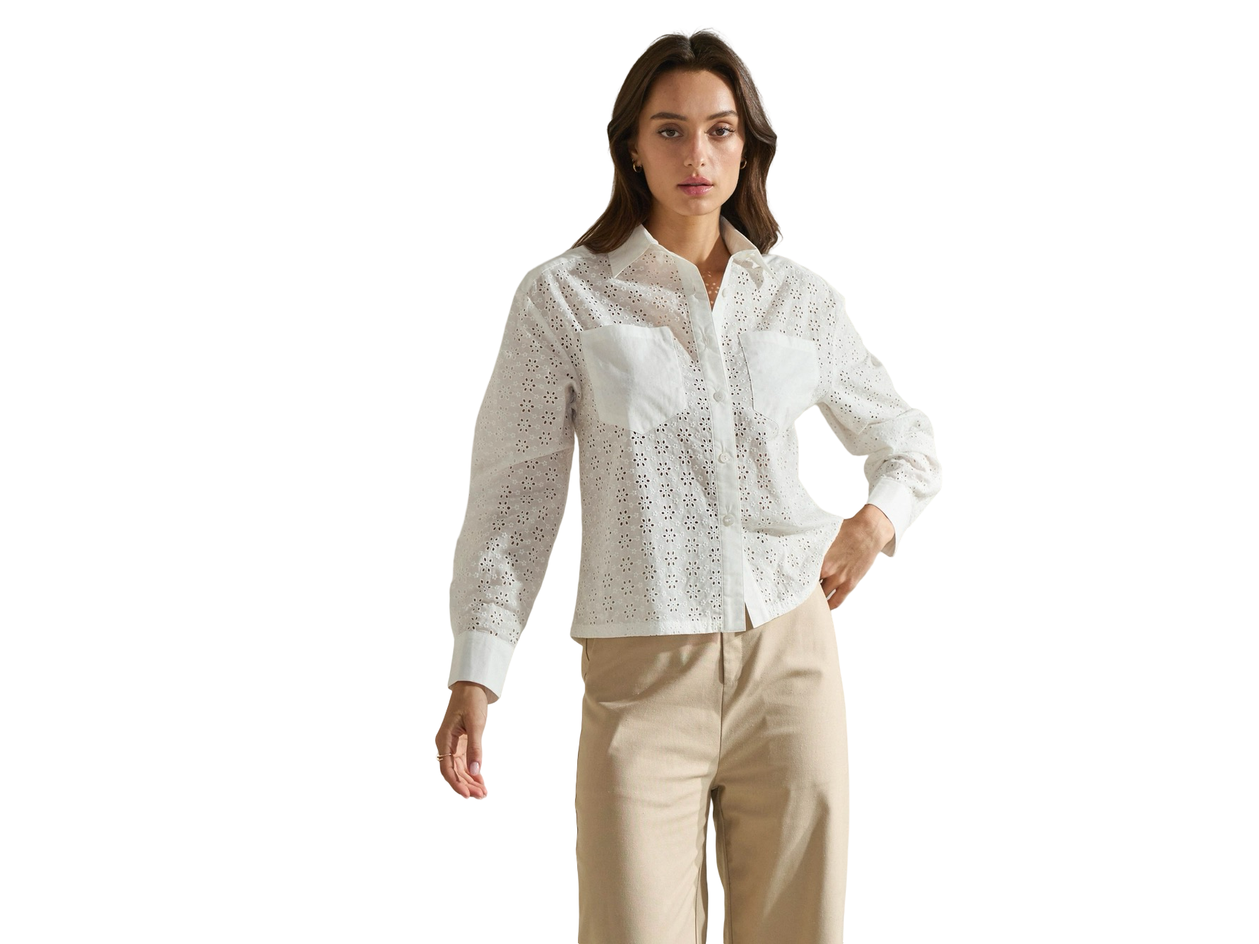 Get ready to look chic and stylish with our Able Double Front Pocket Eyelet Button Down Shirt! The perfect addition to your wardrobe, this shirt features a crisp and clean white color that will elevate any outfit. With its double front pockets, you'll have plenty of room to store essentials on-the-go.