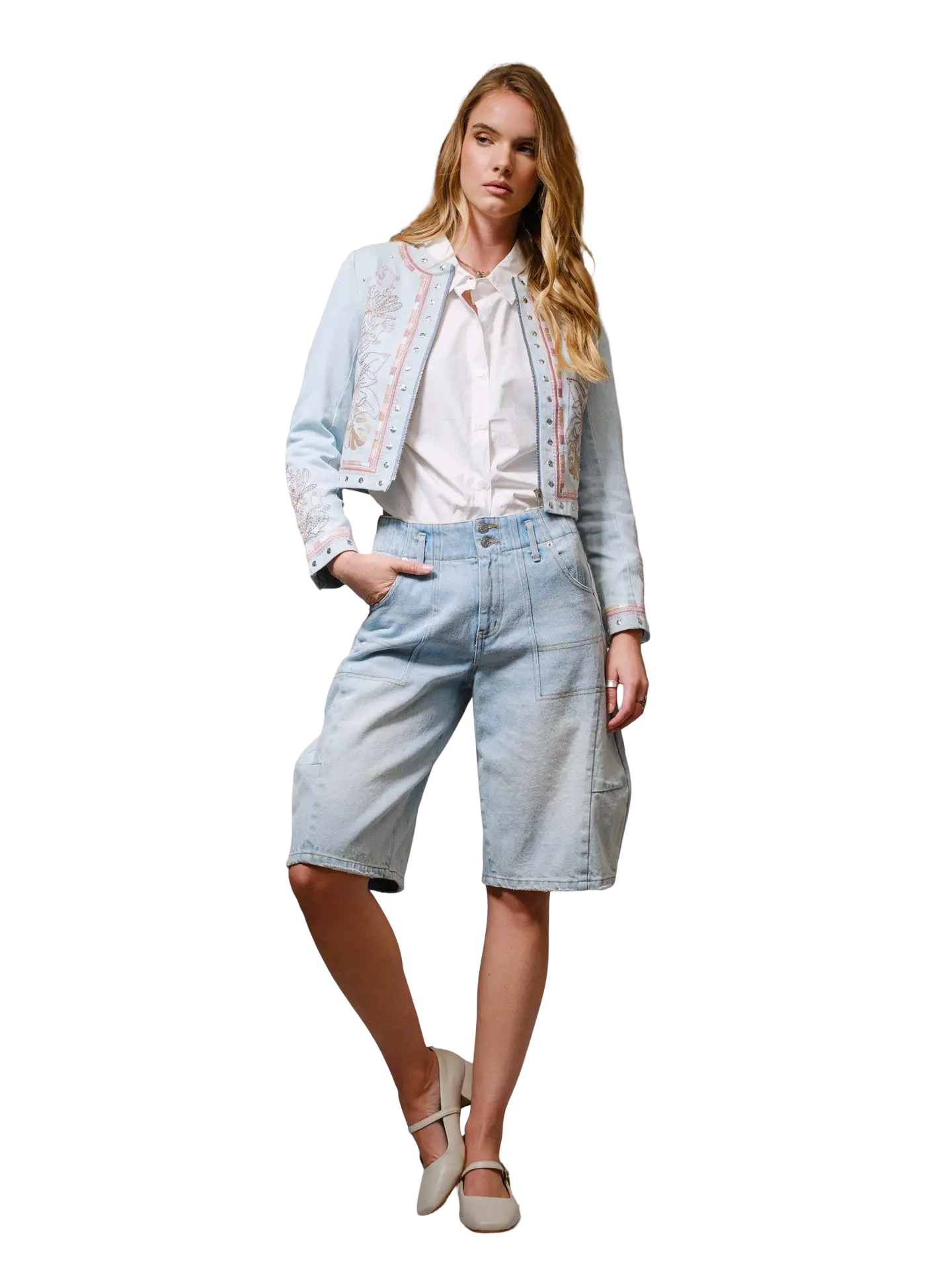 This light wash jacket is not only stunning but also features intricate embroidery and studded detailing. The slightly cropped design adds a stylish touch. Perfect for adding some flare to any outfit! (Only 39 words, meets all guidelines)