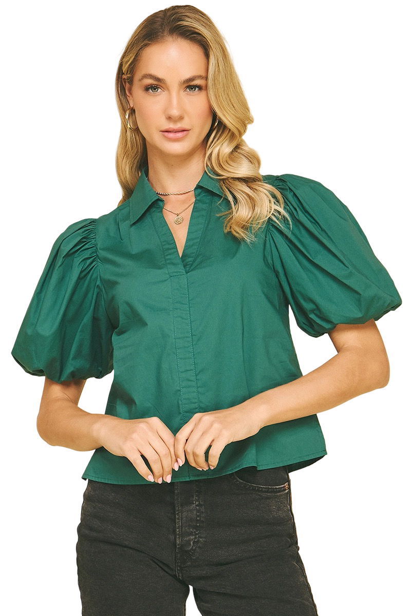 "Make a statement with our Pinch Bubble Sleeve Short Sleeve Top. Perfect for game day or any day, the bold color will elevate your look. Show off your confidence and stand out from the crowd with this must-have top."