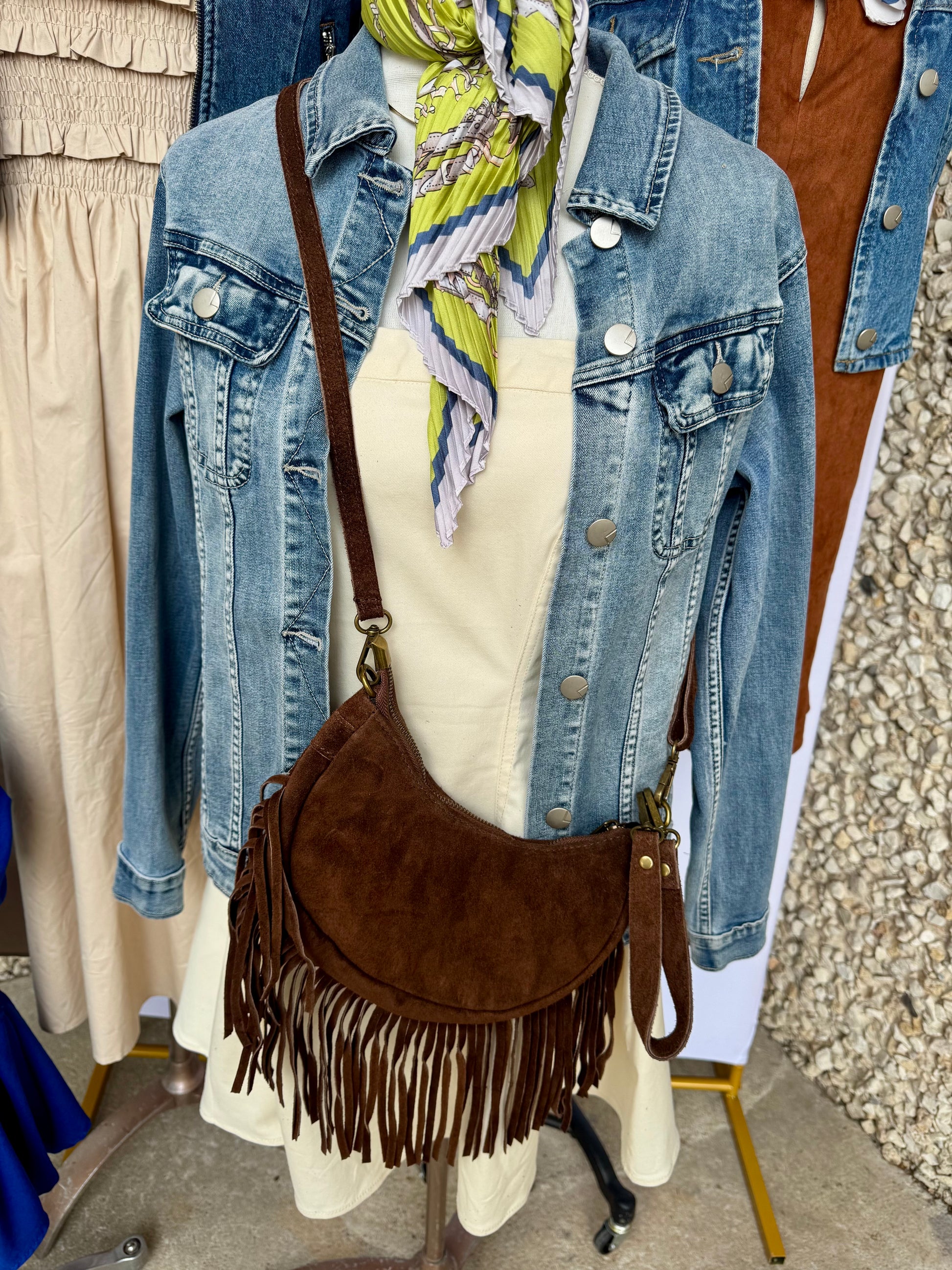 This handbag has a koi design and genuine leather fringe, making it a playful and trendy accessory. Carry your belongings in style with this quirky and genuine bag.