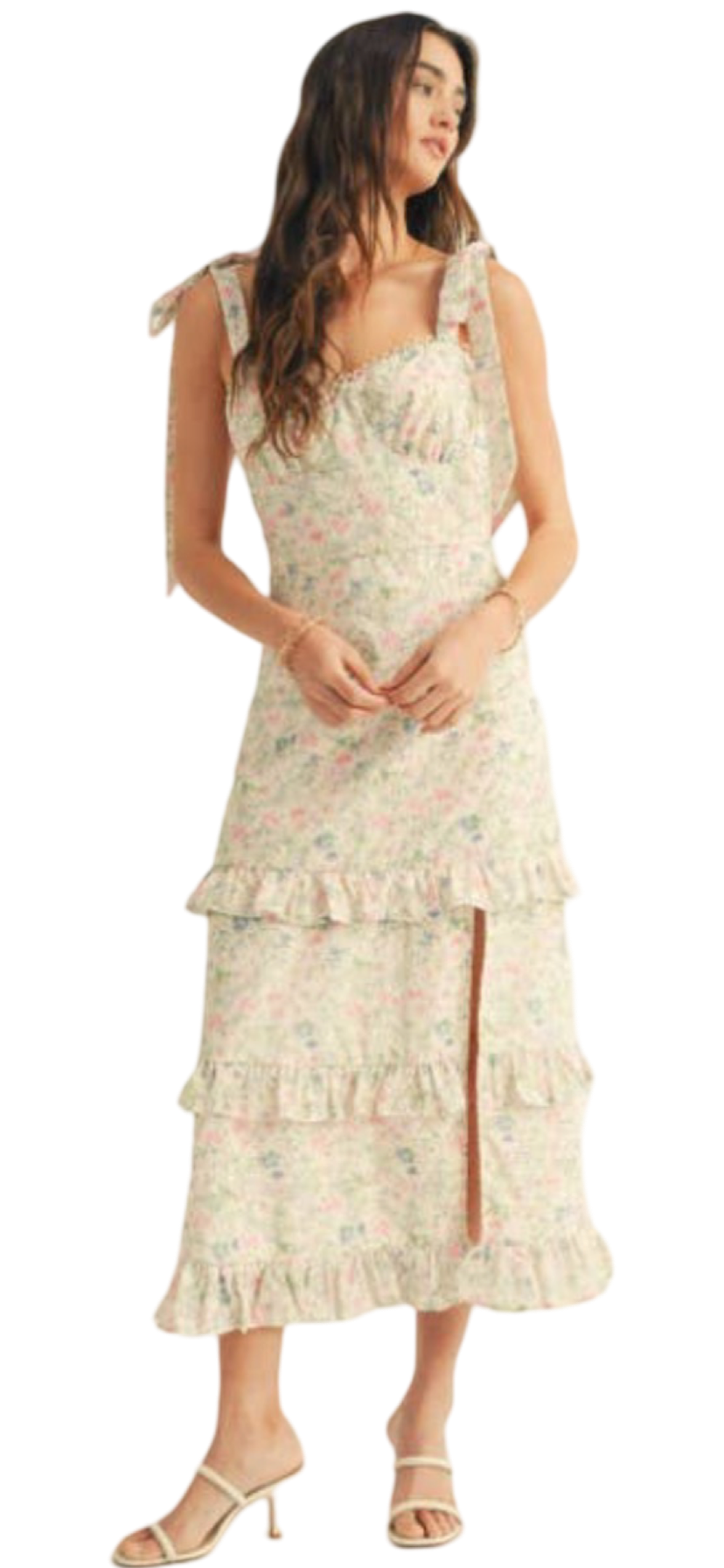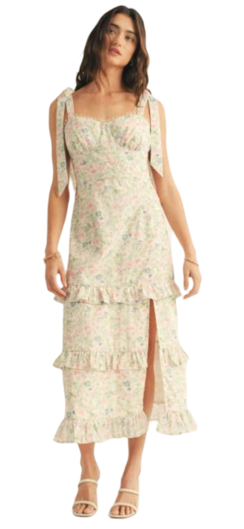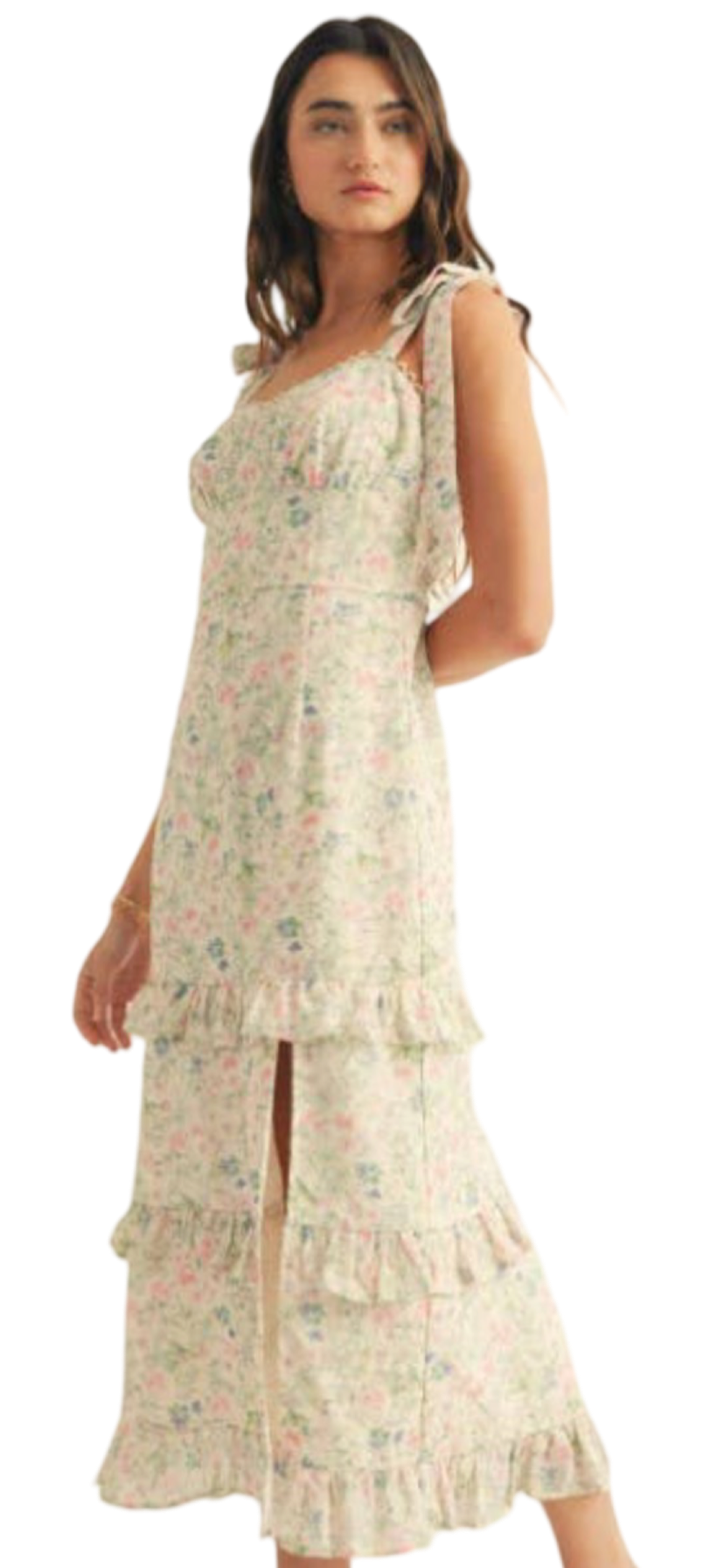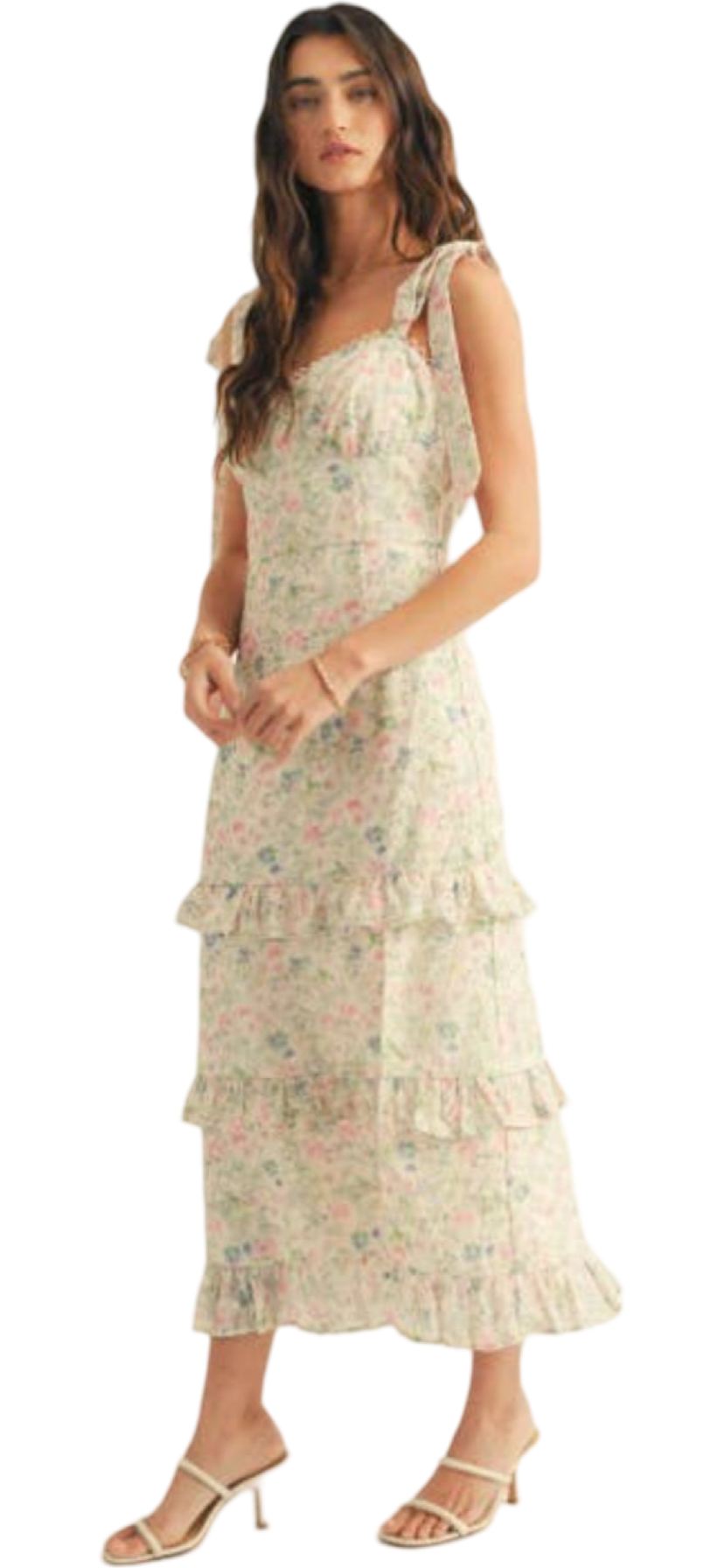 Apparel- Just Me Shoulder Tie Floral Lace Ruffle Detail Maxi Dress