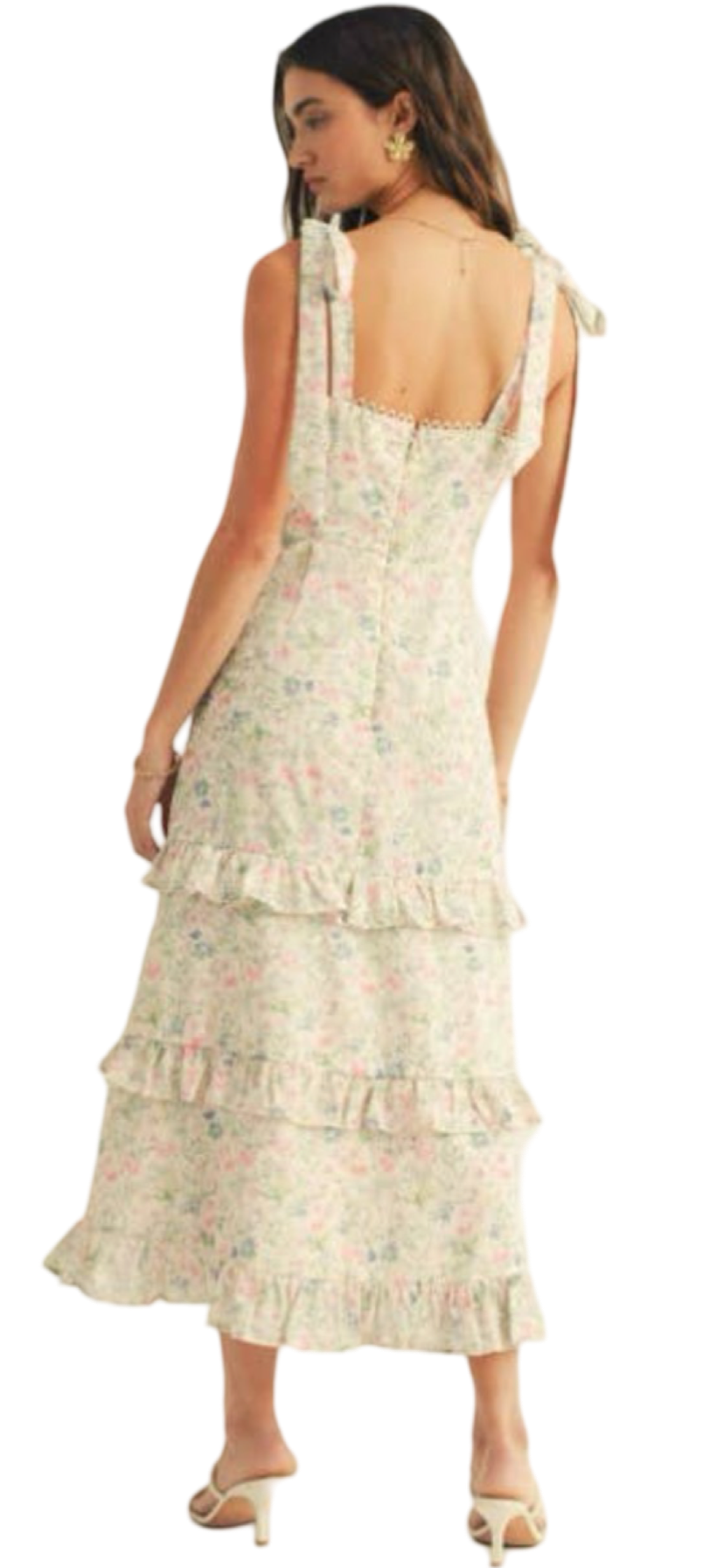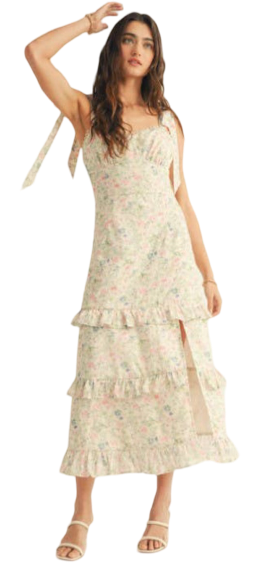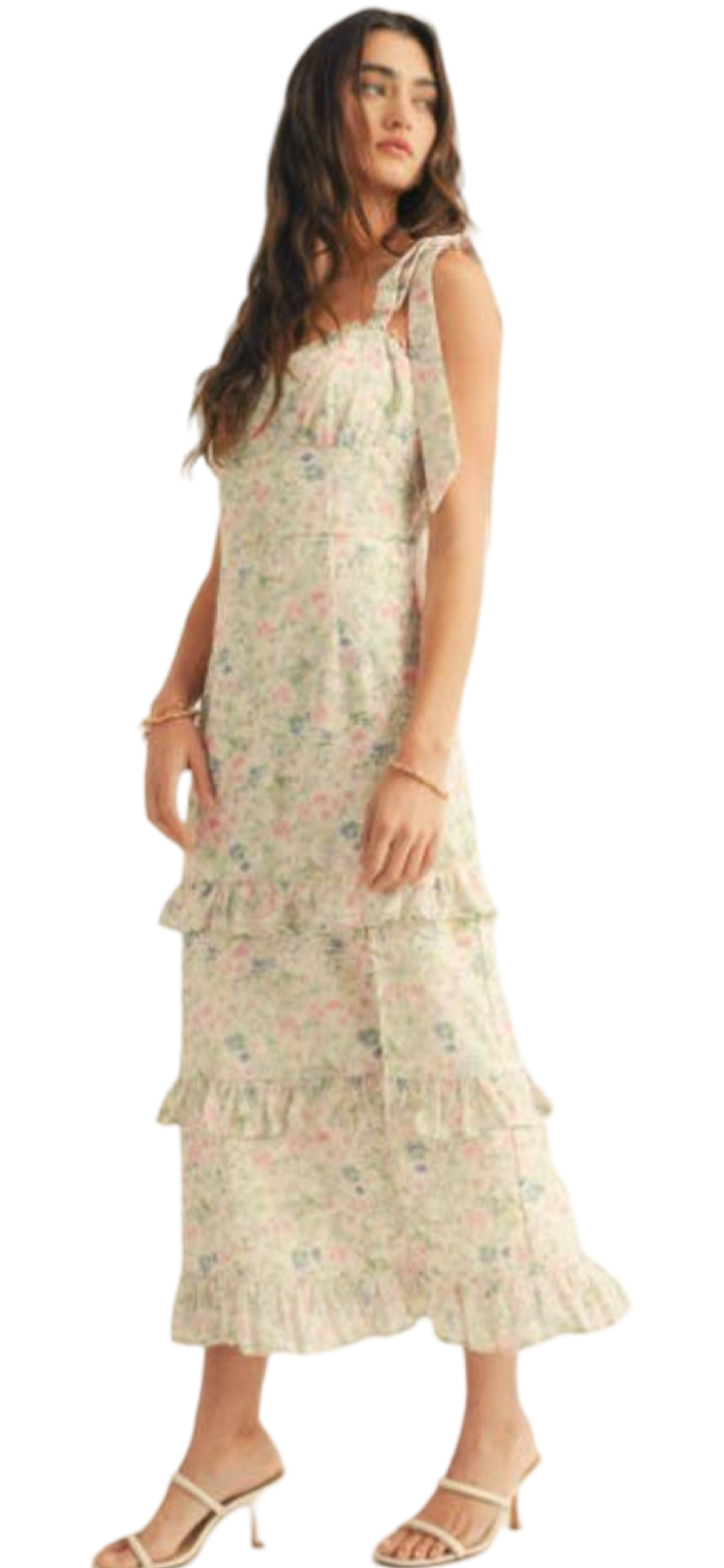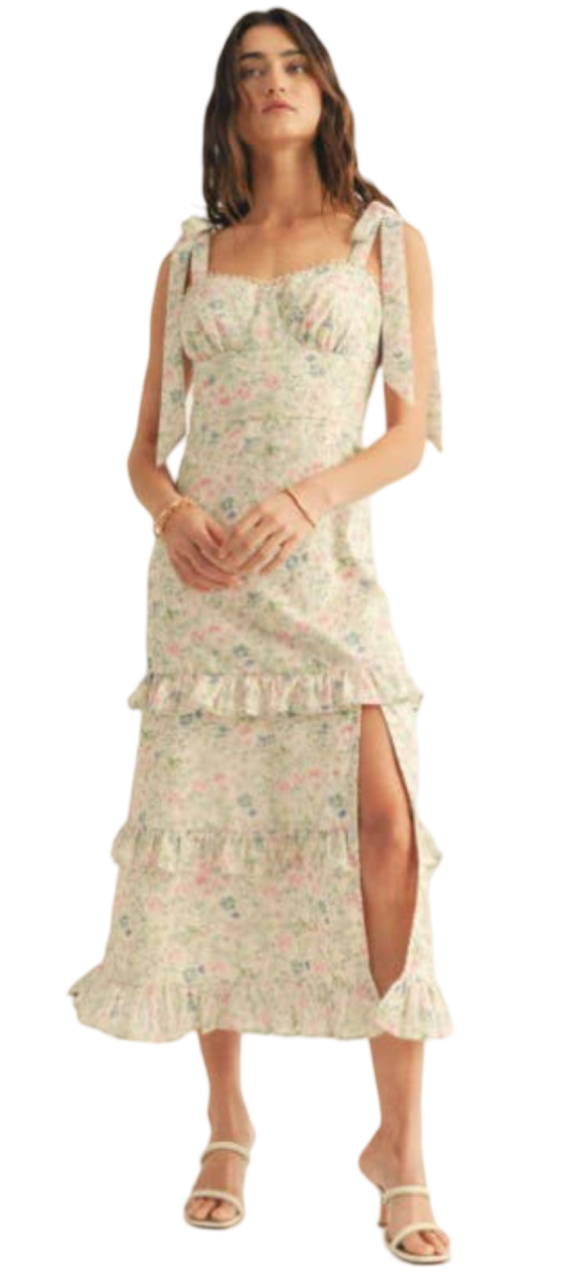 Apparel- Just Me Shoulder Tie Floral Lace Ruffle Detail Maxi Dress